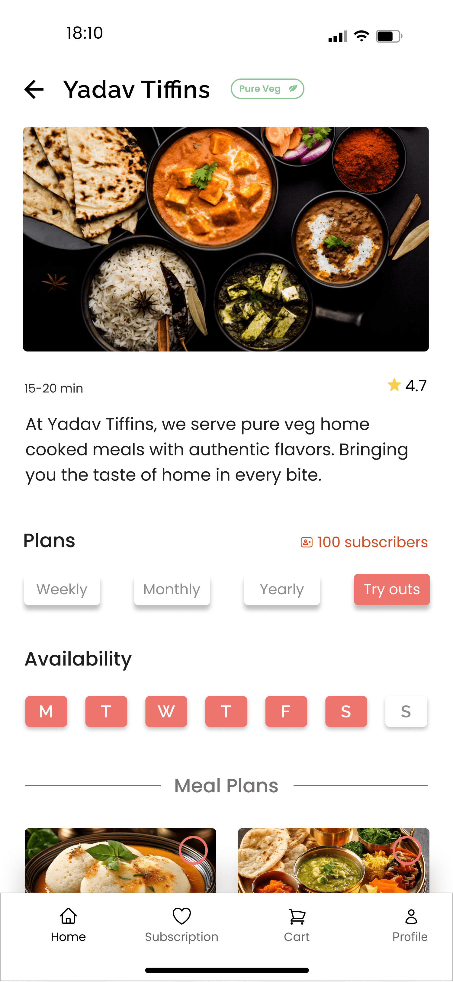Detailed view of a tiffin provider showcasing their offerings, ratings, and meal plan availability across different time slots.