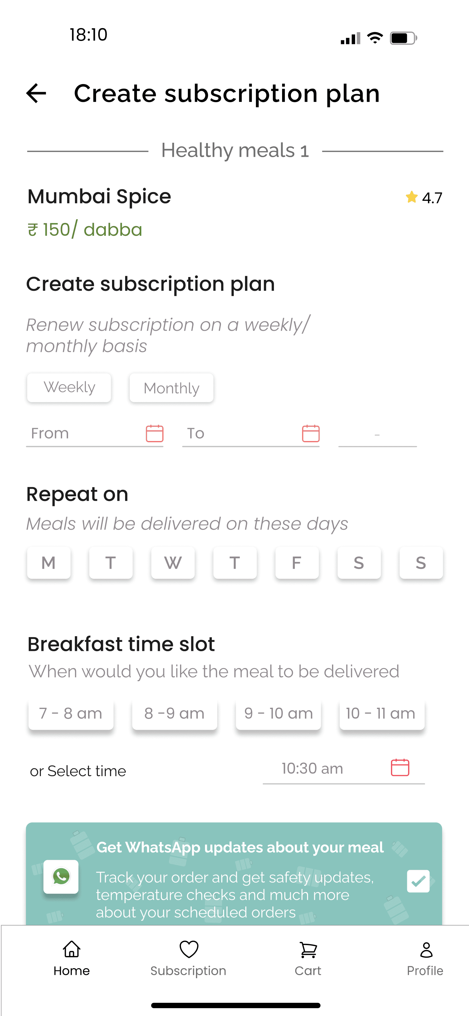 Users can choose a tiffin provider, set weekly/monthly schedules, select delivery days, and meal timing - all in one place